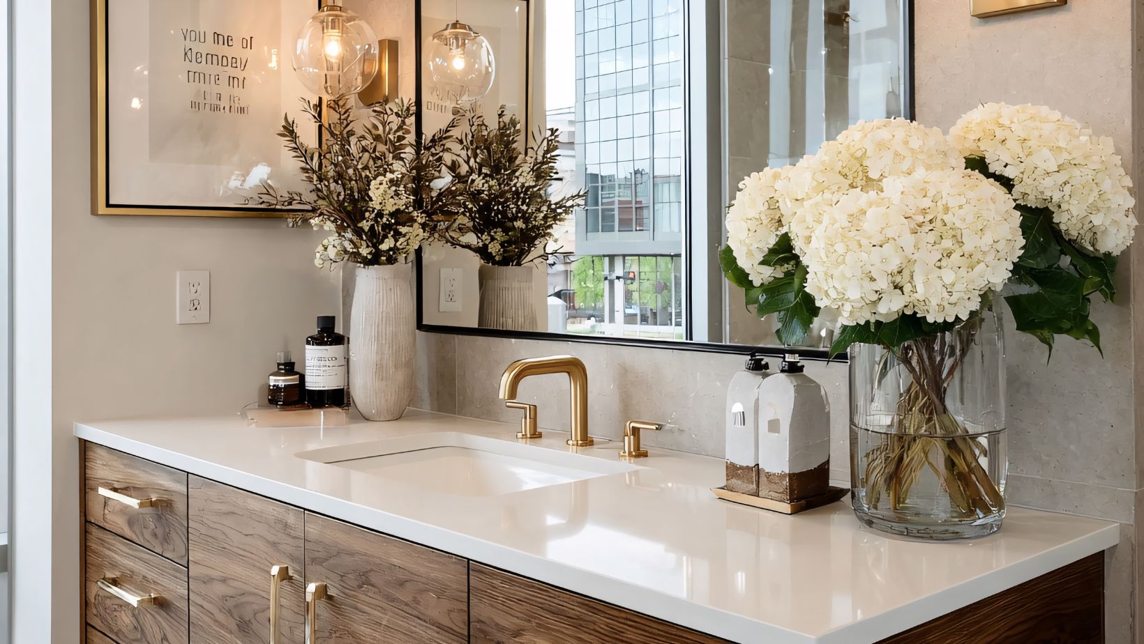 Don’t forget that accessories play an important role in tying a bathroom’s design together. Select hardware, like knobs and pulls, that harmonizes with your vanity. If your vanity is sleek and modern, opt for chrome fixtures. Alternatively, if you’re leaning toward a vintage look, brass or antique bronze could be the way to go.